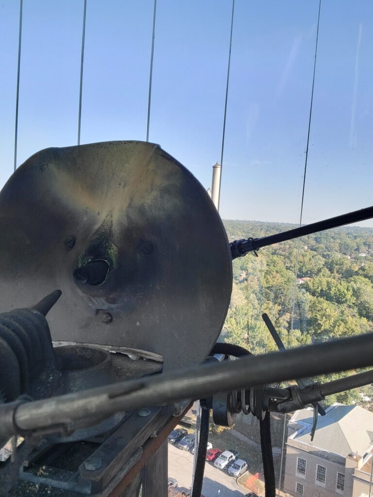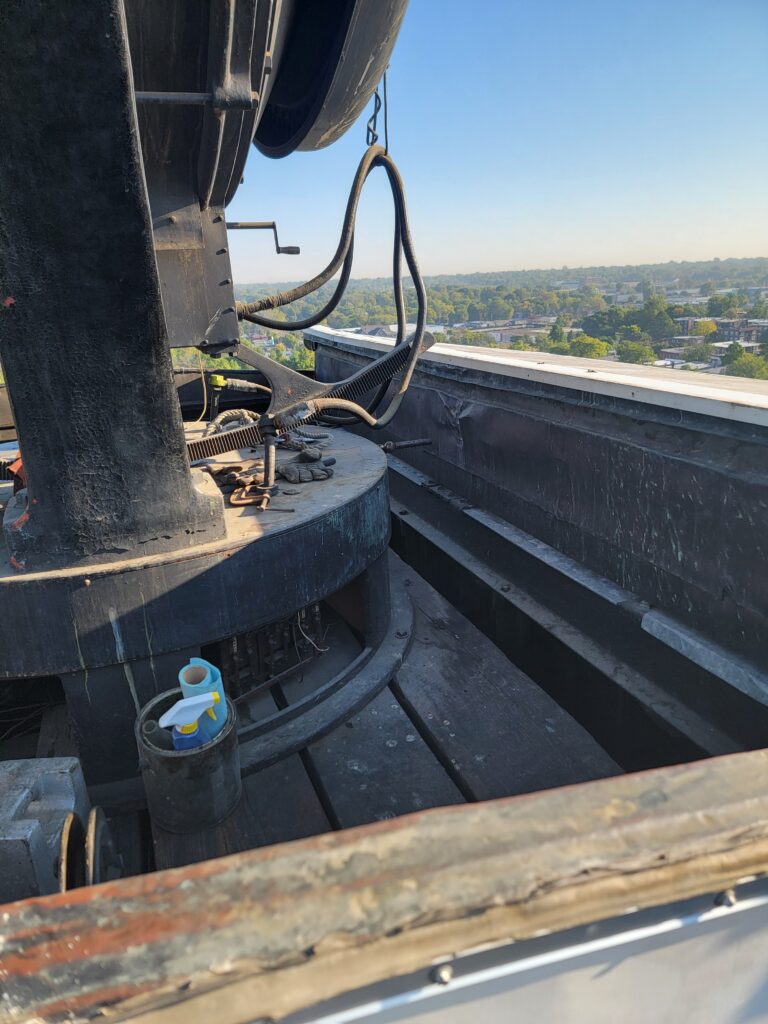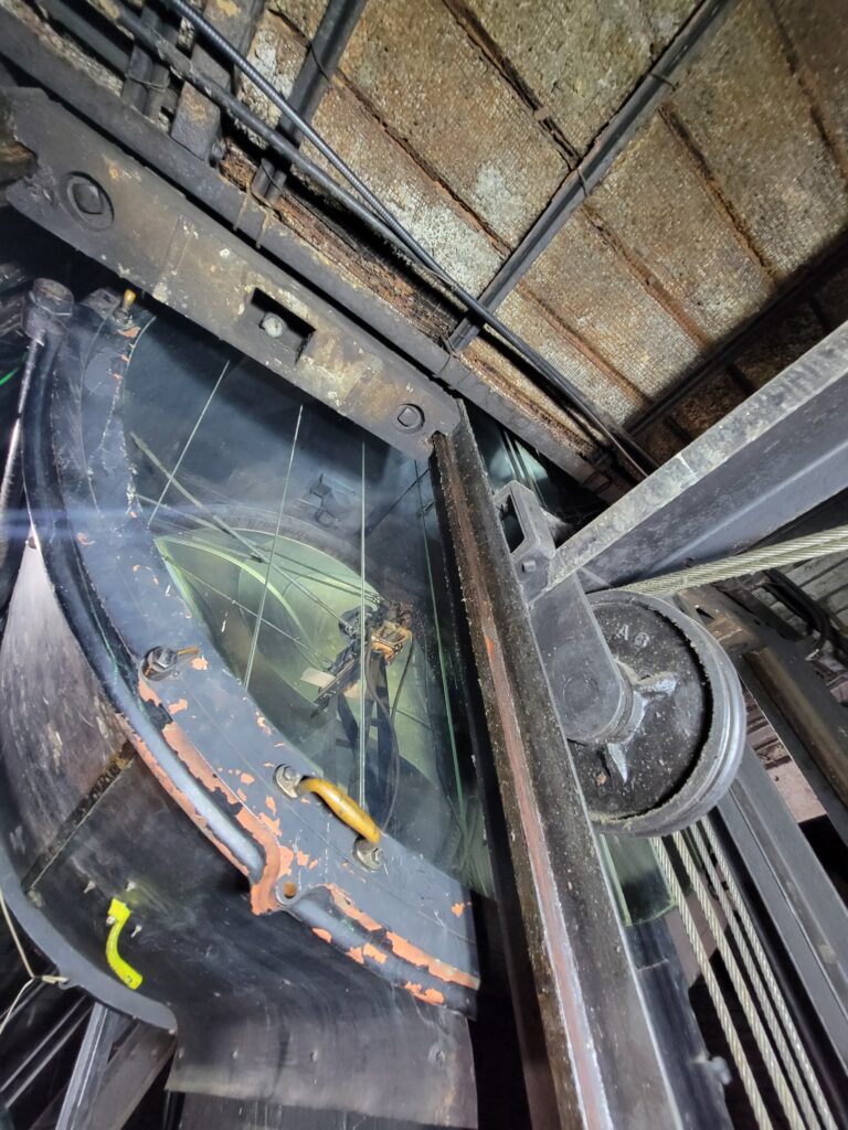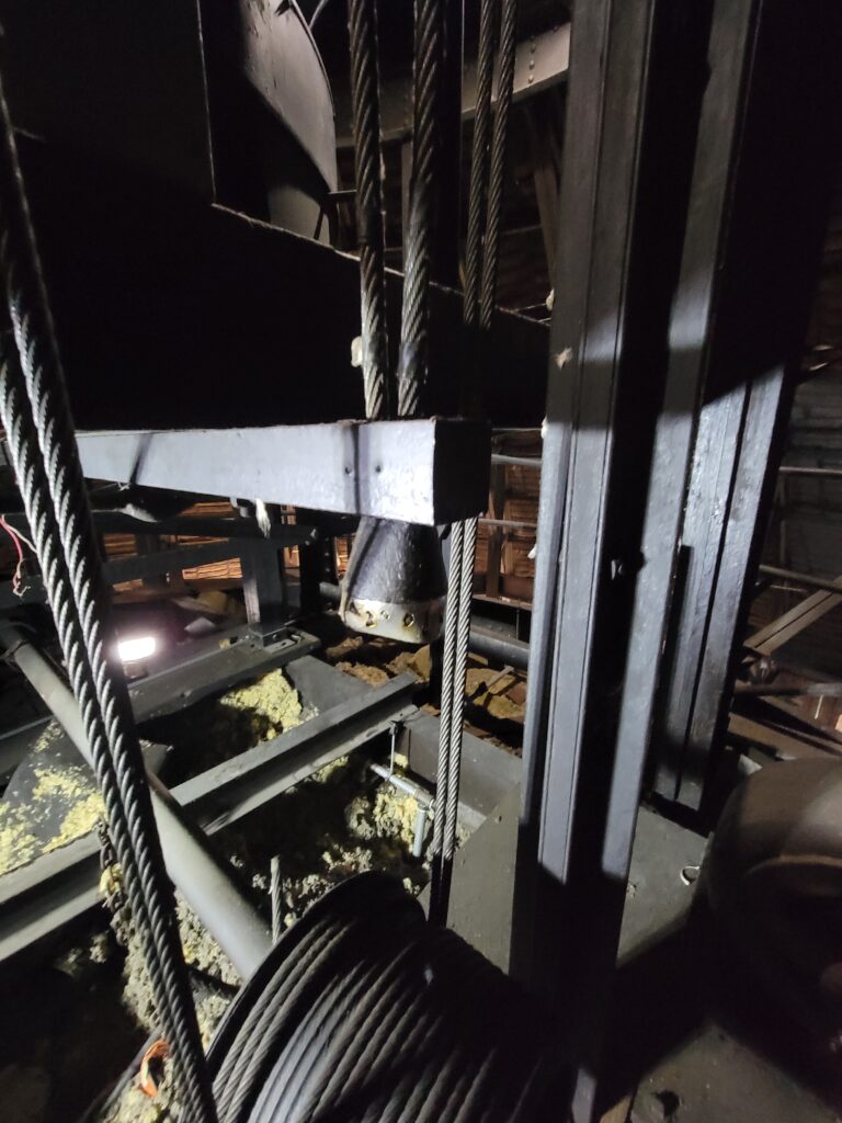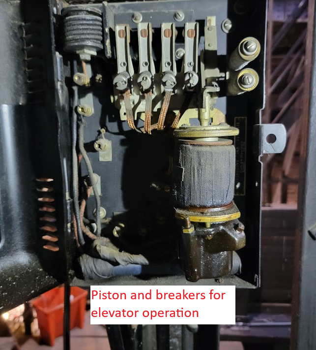 4. The modernization/improvement of the elevator function. The elevator raises and lowers via the motor and counter weight system. In lowering the breakers will trip that control the elevator operation. This is resolved by stopping and then restarting the elevator. It may be that the elevator is encountering resistance coming down or the piston that sets the breakers is bad. The elevator rails have been greased to attempt to resolve this and new oil added to the piston (with the help of the Facilities Manager of University City) to no avail.